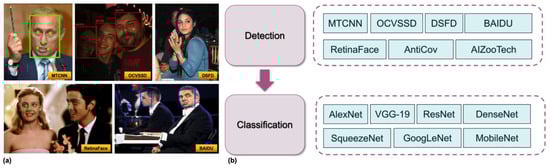 (a) Some widely used face detection models. (b) Two-step workflow diagram for using a face detector and classifier for face mask detection and recognition.