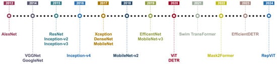 In the second stage of face classification (or face mask classification), the predominant practice involves inputting the cropped face ROIs into pre-trained deep CNNs for feature extraction and classification. Examples of such CNN architectures include AlexNet [], VGG [], ResNet [], SqueezeNet [], DenseNet [], GoogleNet [], and MobileNet []. Figure 4 shows the evolution of deep neural network modules. Depending on the network size and downstream application requirements, researchers may opt for lightweight models with fewer parameters suitable for embedded or mobile environments (e.g., MobileNet) to achieve higher accuracy. During this process, some studies further analyze the degree of occlusion of facial keypoints (e.g., whether the nose is exposed, whether the mask covers both the nose and mouth) to make more nuanced judgments regarding the correctness of mask wearing. To mitigate detection challenges posed by multiple poses, varying lighting conditions, or partial occlusions, certain systems perform face alignment or keypoint correction prior to inputting the ROI, thereby enhancing the classification model’s tolerance to occlusion and deformation.