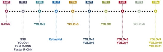 In addition to feature-extraction-and-classification-based methods, face mask detection approaches based on object detection models have also achieved significant progress in recent years [,,,,,,,,,,,,,,,,,,,,,,,,,,,,,,,,,,,,,,,,,,,,,,,,,]. Object detection models, by simultaneously performing localization and classification of targets within an image, can efficiently handle multi-object and multi-scale detection tasks, making them particularly suitable for scenarios with dense crowds and complex backgrounds. Figure 5 shows the development of DL-based object detection models, which encompass a range of advanced object detection models, including the R-CNN series, the YOLO family of models, and the SSD framework, which collectively represent significant milestones in the evolution of deep learning-based object detection methodologies. With the continuous evolution of DL technologies, single-stage and two-stage detectors have each demonstrated unique advantages: single-stage detectors, characterized by their high inference speed, are well-suited for real-time monitoring and for applications with limited resources, whereas two-stage detectors excel in scenarios requiring precise identification and high accuracy due to their superior detection precision. Moreover, to meet the real-time and computational resource constraints of practical applications, researchers have been exploring lightweight and improved methodologies. Techniques such as model pruning, quantization, and knowledge distillation are employed to optimize the performance and efficiency of detectors. The following subsections will provide a detailed introduction to the specific applications and development trends of single-stage object detectors, two-stage object detectors in the context of face mask detection.