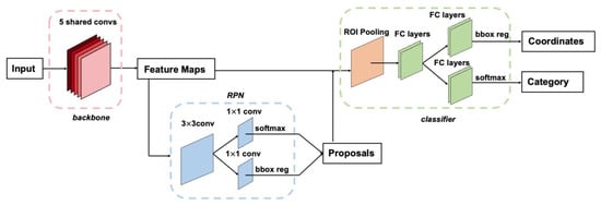 When encountering difficult scenes, such as those at multiple scales, those with small targets and those that are crowded, the R-CNN series has a strong advantage in detection accuracy. In 2014, Girshick et al. [] proposed a two-stage R-CNN model for the first time by improving on the basis of a convolutional neural network, which used AlexNet [] for feature extraction, and the final MAP was also much improved over the traditional method. Girshick et al. [] introduced a spatial pyramid pooling network on this basis and proposed the Fast R-CNN model. After the previous iteration, the Faster R-CNN [] network was proposed in 2017. From a convolutional neural network to Faster R-CNN network, the process of target detection based on DL has become increasingly streamlined, accurate and fast.