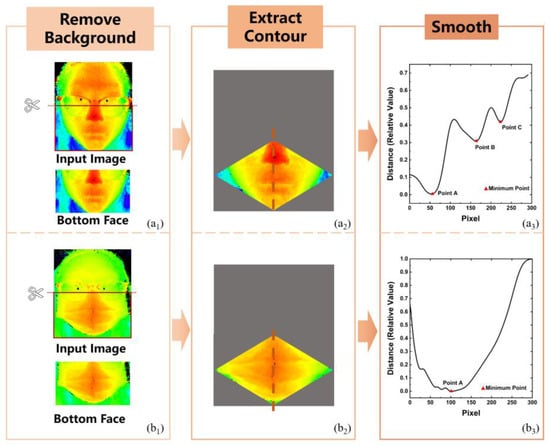 Overview of facial contour extraction. (a1) Remove background of the image without a mask; (a2) Extract contour of the image without a mask; (a3) Smooth contour curve of the image without a mask; (b1) Remove background of the image with a surgical mask; (b2) Extract contour of the image with a surgical mask; (b3) Smooth contour curve of the image with a surgical mask [].