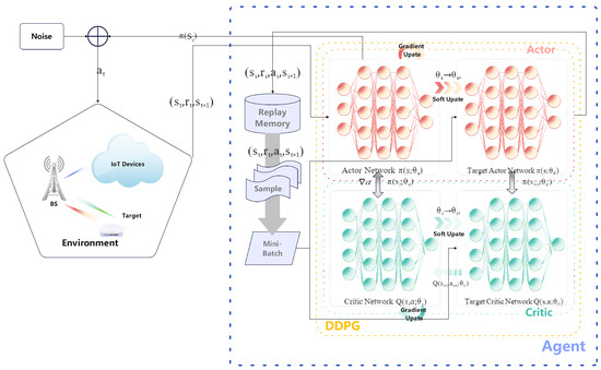 where is a small constant that controls the rate of target network updates. The agent stores its experiences in a replay buffer . In the procedure of training, the agent samples mini-batches from the buffer to break the correlation between consecutive experiences. At each time step, the actor network is used to select an action . To encourage exploration, Ornstein–Uhlenbeck noise is added to the action, making the action selection stochastic [47].