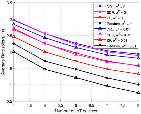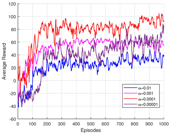 Figure 3 illustrates the learning performance of the proposed DRL-based framework under different learning rates, specifically , , , and . At the start of training, the model receives negative rewards, reflecting its initial difficulty in adapting to the environment’s dynamics. During the first 100 episodes, the system encounters a penalty term in (27), causing the rewards to oscillate within the negative range. This negative oscillation underscores the challenges the agent faces in exploring the solution space effectively during the early training phase. As the model gradually adapts to the environment and learns the underlying channel conditions, the rewards steadily improve, transitioning into a positive incentive phase. The results demonstrate that the learning rate plays a critical role in influencing the model’s training performance. Among the tested values, the learning rate of achieves the best performance, striking an optimal balance between convergence speed and training stability. In contrast, excessively low learning rates impede the model’s ability to generalize, resulting in underfitting and suboptimal performance.
