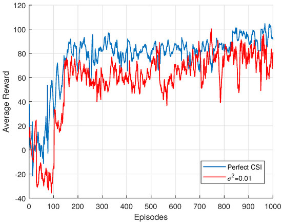 As shown in Figure 4, the system with perfect CSI demonstrates faster and more stable convergence, with the rewards steadily increasing and eventually stabilizing at a higher value. In comparison, the system with imperfect CSI experiences a slight degradation in performance. Specifically, the imperfect CSI condition results in slower learning, as evidenced by the delayed rise in rewards. The oscillations are more pronounced, and the overall learning process takes longer to reach the positive reward phase compared to the perfect CSI scenario. This suggests that the uncertainty introduced by imperfect CSI compromises the model’s ability to robustly adapt to the environment, thereby slowing down the learning process and affecting performance stability.