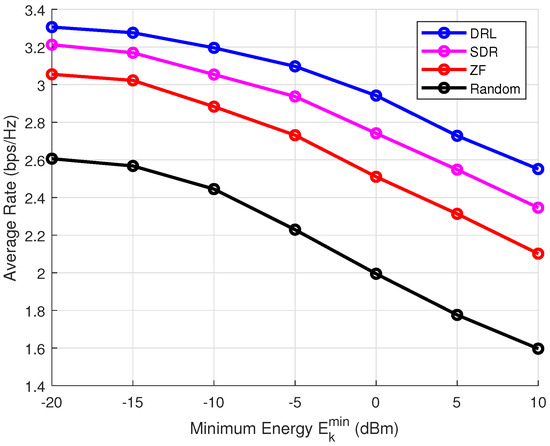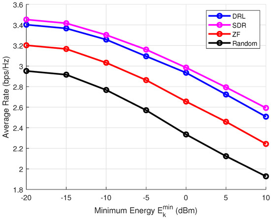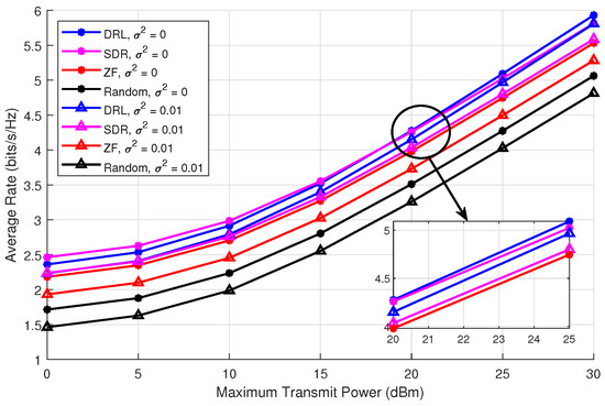 Next, we evaluate the average rate of the ISCPT system as a function of the maximum transmit power, which ranges from 0 dBm to 30 dBm. The results, presented in Figure 5, demonstrate how the average rate varies with transmit power. Here, DRL refers to the method proposed in this paper, while semidefinite relaxation (SDR) represents a optimal solution as explored in previous studies [21]. ZF indicates beamforming via the zero-forcing algorithm, and random denotes random beamforming.