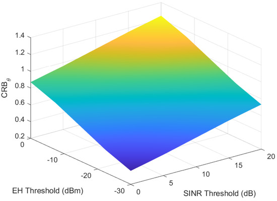 The CRB for the parameters , , and is the inverse of the Fisher information matrix. For the imperfect CSI case, the calculation of the concrete Fisher information matrix is provided in Appendix B. The CRB for can be expressed as