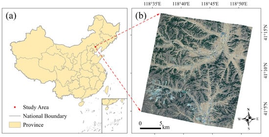 The study area: (a) location of the study area; (b) GF-7 MUX multispectral image of the study area.