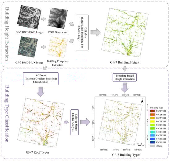 Workflow of the fine-grained building classification. The process of extracting building height from GF-7 data is also demonstrated.