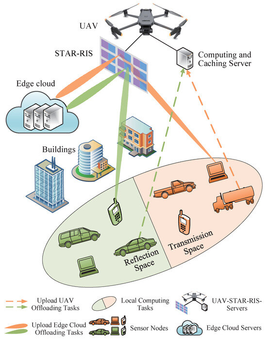 Recently presented, a promising approach to reducing UAV energy consumption involves the deployment of simultaneously transmitting and reflecting reconfigurable intelligent surfaces (STAR-RISs) as an alternative to UAVs for signal relaying [14]. Each element of a STAR-RIS, capable of supporting both electric and magnetic currents, can simultaneously reconfigure transmitted and reflected signals, thereby achieving full-space coverage [15,16]. However, most existing studies in this field assume that STAR-RISs are deployed in a fixed position [17], with UAVs primarily offering computing [18,19] or caching capabilities [20,21,22]. The fixed deployment of STAR-RISs limits their ability to flexibly adjust the distance between themselves and the sensors, thereby degrading task offloading transmission performance. Other studies have proposed mounting STAR-RISs on UAVs, but UAVs do not have computing and caching resources [23,24]. Consequently, UAVs serve only as flight carriers, leaving their potential computing and caching capabilities underutilized. This significantly reduces resource utilization and overall task processing efficiency in UAV-based WSNs.