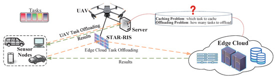 Illustration of task caching and offloading for STAR-RIS-aided UAV system.