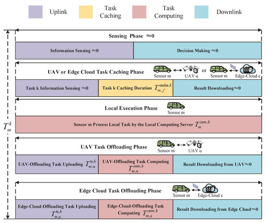 We denote , as task k is not cached, and offloading decision variable . Therefore, the uplink transmission delay of offloading task k from sensor m to node can be expressed as