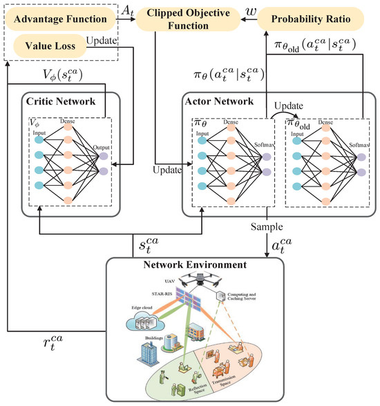 To address these challenges, we utilize the proximal policy optimization (PPO) algorithm, a DRL method. As shown in Figure 5, the PPO algorithm uses neural networks to model complex relationships between system states and actions, learning directly from interactions with the environment. By leveraging the PPO algorithm, caching decisions are dynamically adjusted based on real-time network conditions, such as caching state, content popularity, historical request access frequency, and network topology. The intelligent agent iteratively updates its caching strategy to maximize a reward function reflecting caching efficiency, like the cache hit rate, enabling near-optimal caching strategies that adapt to changing conditions and enhance overall system performance.