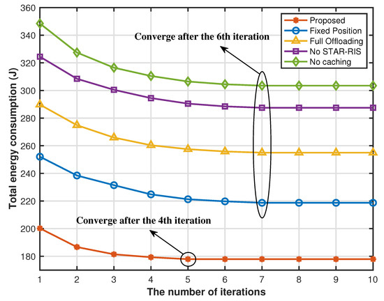 Figure 6 plots the total energy consumption of the system versus the number of iterations. We see that the proposed method can ensure that the total energy consumption of the system converges to the optimal value after only serval iterations, confirming that the optimal caching strategy, partial offloading strategy, the hovering position of the UAV, and the STAR-RIS transmission and reflection matrix are always available. Moreover, the convergence speed of the four benchmark schemes is slightly slower than that of the proposed scheme. Finally, this figure can verify that the energy consumption of the proposed STAR-RIS-aided computing offloading and content caching framework for UAV systems is less than that of other benchmark schemes.