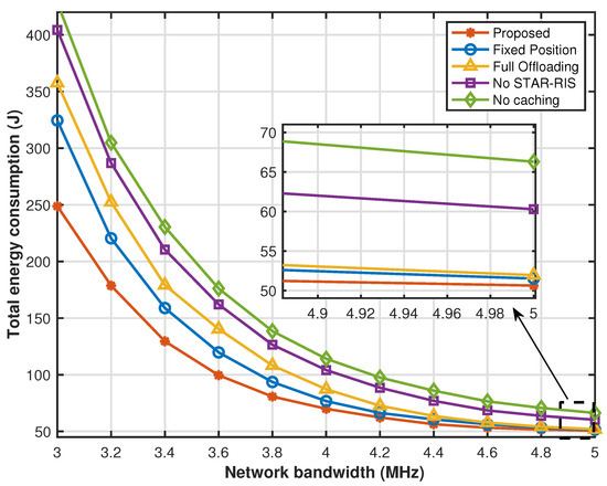 Figure 7 shows the total energy consumption of the system versus the network bandwidth. The results show that the total energy consumption of the five schemes decreases with the increase in network bandwidth. The reason is that the increase in network bandwidth for offloading improves the transmission rate between sensors and the UAV, as well as the transmission rate among the sensors, the STAR-RIS, and the edge cloud, reducing the transmission delay and energy consumption. At a lower network bandwidth, the proposed caching strategy optimization, UAV hovering position optimization, partial offloading optimization, and STAR-RIS transmission reflection coefficient matrix significantly reduce energy consumption compared with other comparison strategies. However, as the network bandwidth increases, it helps to increase the task transmission rate, making the impact of network bandwidth in system energy consumption dominant. The system energy consumption of other benchmark solutions gradually approaches that of the proposed solution, but through the proposed joint optimization policy, our system performance is always optimal.