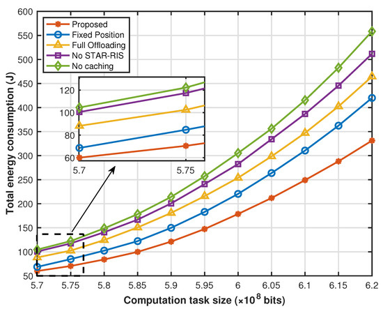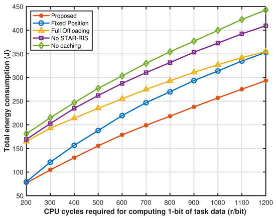 Figure 8 shows that as the CPU cycles required for computing 1 bit of task data increase, the system consumes more computing resources when calculating tasks of the same size, thereby increasing computing energy consumption. However, when the computing power of drones and local sensors is limited, more tasks are offloaded to the edge cloud for processing, which increases transmission energy consumption. At the same time, as the number of offloaded tasks increases, network resources become increasingly limited. Under the condition of limited network resources, the cache strategy optimization, drone hovering position optimization, and STAR-RIS transmission reflection coefficient matrix optimization strategies we proposed can significantly reduce system transmission energy consumption compared with other comparison strategies. Therefore, the system energy consumption gap between the proposed solution and other benchmark solutions will gradually widen. However, as network resources become increasingly limited, the network energy consumption under full offloading is only affected by computing resources, resulting in an increase in computing energy consumption, and the transmission energy consumption does not change much. Therefore, the system energy consumption of full offloading solutions gradually approaches that of the proposed partial offloading solution.