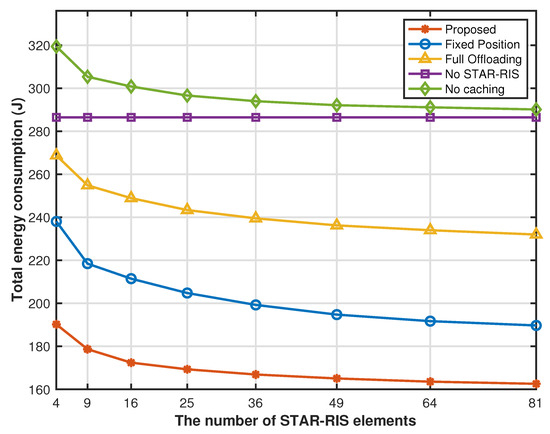 Figure 10 shows that the system energy consumption of all STAR-RIS-related schemes decreases significantly as the number of STAR-RIS elements increases. This is because STAR-RIS elements can provide more channel gain and effectively reduce transmission energy consumption. However, the no-STAR-RIS policy directly transmits some task requests sent by the sensor to the edge cloud without using the STAR-RIS transmission reflection coefficient matrix for transmission. Therefore, as the number of STAR-RIS elements increases, the system energy consumption under this strategy remains unchanged. At a smaller number of STAR-RIS elements, the energy consumption of the proposed cache strategy optimization, drone hovering position optimization, partial offloading optimization, and STAR-RIS transmission reflection coefficient matrix are significantly reduced compared with other comparison strategies. However, as the number of STAR-RIS elements increases, this provides more channel gain, which greatly reduces the transmission energy consumption of the system offloading tasks to a more distant cloud for processing. Therefore, the gap between the system energy consumption of other benchmark solutions and the energy consumption of the proposed solution gradually narrows, but through the proposed joint optimization strategy, our system performance is always in the optimal state.