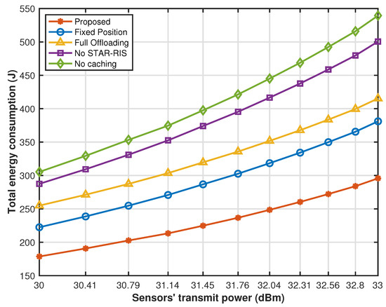 Figure 11 illustrates that the system energy consumption of all schemes increases significantly with the increase in the sensors’ transmit power. This is because as the sensor’s transmission power increases, the transmission delay gradually decreases, but the transmission energy consumption is proportional to the sensor’s power. Therefore, when the sensor’s offloading ratio remains unchanged, the overall energy consumption of the system gradually increases. At smaller sensor’s transmit power, the energy consumption of the proposed cache strategy optimization, drone hovering position optimization, partial offloading optimization, and STAR-RIS transmission reflection coefficient matrix is significantly reduced compared with other comparison strategies. However, as the sensor’s transmission power increases, it greatly increases the transmission energy consumption of the system offloading tasks to the edge cloud or UAV for processing. Therefore, the gap between the system energy consumption of other benchmark solutions and the energy consumption of the proposed solution gradually narrows, but through the proposed joint optimization strategy, our system performance is always in the optimal state.
