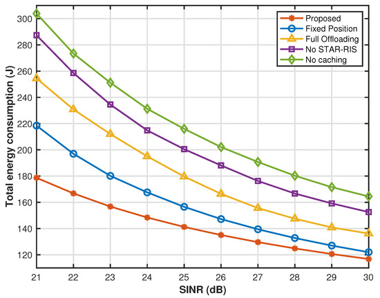 We define the SINR as . It can be seen from Figure 12 that at greater SINR, the signal strength is relative to the noise. That is to say, the signal transmission quality will be better, thus improving transmission efficiency, which helps to reduce energy consumption during the transmission process. At a smaller SINR, the energy consumption of the proposed caching strategy optimization, UAV hovering position optimization, partial offloading optimization, and STAR-RIS transmission reflection coefficient matrix is significantly reduced compared with other comparison strategies. However, as the SINR increases, this provides a better channel state, which greatly reduces the transmission energy consumption of the system offloading tasks to a more distant cloud for processing. Therefore, the gap between the system energy consumption of other benchmark solutions and the energy consumption of the proposed solution gradually narrows, but through the proposed joint optimization strategy, our system performance is always in the optimal state.