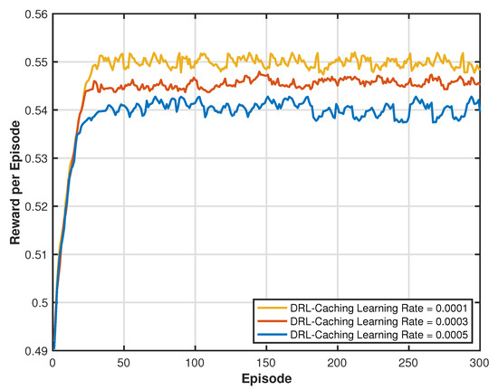 Figure 13 illustrates the convergence of the average weighted reward per episode for the DRL caching agent at varying learning rates. As seen in the figure, it is evident that the DRL caching agent converges rapidly at all learning rates and achieves optimal performance at a learning rate of 0.0003. A higher learning rate results in the current Q-value having more influence than the prior Q-value, leading to faster updates. However, excessively high learning rates may destabilize the learning process and hinder convergence by over-adjusting to recent rewards. Therefore, selecting an appropriate learning rate is crucial to balancing the learning speed and stability for optimal performance.