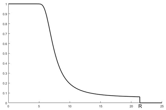 The maximum perception radius is introduced, and the perception probability decreases to 0 when the distance is greater than . The perception probability calculation Formula (27) is modified as follows, and the change curve is shown in Figure 2.