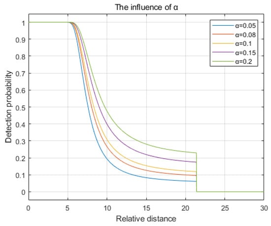 The acceptable false alarm rate is set to 0.05, 0.08, 0.1, 0.15, and 0.2. The curve depicting detection probability as a function of relative distance is illustrated in Figure 3. It can be observed from the figure that as the false alarm rate increases, the rate of decay in the detection probability slows, and the convergence value of the detection probability rises. However, the sensing radius remains unaffected.