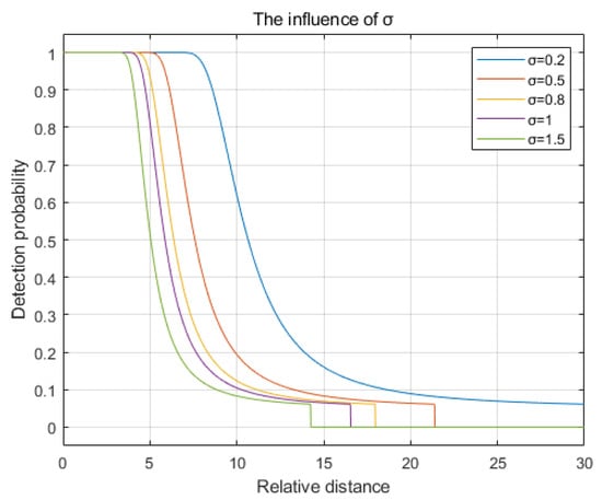The variance to 0.2, 0.5, 0.8, 1, and 1.5. The comparison chart illustrating the changes in detection probability is shown in Figure 4. As observed from the figure, as the variance increases, the rate of decay in detection probability accelerates, the decay starts earlier, and the sensing radius decreases.