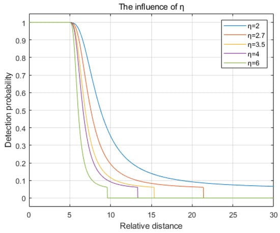 The path loss coefficient is set to values of 2, 2.7, 3.5, 4, and 6. The comparison chart illustrating the changes in detection probability is shown in Figure 5. As observed in the figure, with an increase in the number of obstacles, represented by a higher path loss coefficient , the rate of decay in detection probability accelerates, and the detection radius decreases.