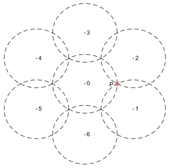 Under the joint perception of multiple sensors, the peripheral sensor nodes (nodes 1–6 in Figure 7) can be positioned slightly farther from the central node (node 0) while still ensuring full area coverage. According to the principles of the Voronoi diagram, the perception probability at the boundaries between sensor coverage areas is minimized, such as at point in Figure 7. This point is equidistant from the three closest sensor nodes (0, 1, and 2), with this distance being the defined sensing radius in the 0/1 model.