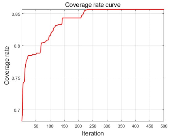 The parameters for the perception model are configured according to Table 2, with a satisfactory joint perception probability . The test deploys 15 sensor nodes within a range of , and the area coverage rate is calculated using Equation (35). The coverage rate curve generated by the intelligent algorithm is shown in Figure 8.
