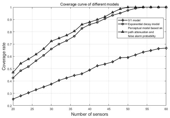 The test evaluates coverage over areas using the 0/1 perception model, the exponential decay perception model, and the perception model based on path loss and false alarm probability. The number of coverage nodes is varied from 20 to 60. The experimental environment, coverage conditions, and optimization algorithms adopted in the test are the same. The regional coverage rate is obtained by Formula (33), and the difference only lies in the different formula of perception probability of the target point substituted by different perception models. For the 0/1 perception model, the exponential decay perception model, and the perception model proposed in this paper, Formula (1), Formula (2), and Formula (30) are used, respectively. The resulting change in area coverage rate is shown in Figure 10.