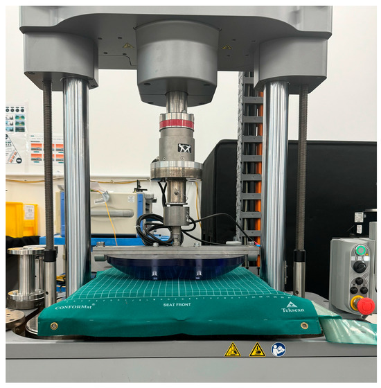 To perform the loading conditions, a ‘buttock shaped’ indenter characterised by two semispherical halves sectioned from a 380 mm diameter sphere was used (Figure 1). Each hemisphere was 3D printed in Onyx material, which is a micro carbon fibre filled nylon, using a Markforged MKII 3D printer (Markforged, Waltham, MA, USA). This represents a sufficiently rigid material, whose mechanical properties are reported in Table 2, that does not deform following the application of the loading conditions. It was constructed following the ISO/FDIS 16840-12:2021(E) [7] for the envelopment and immersion characterisation of seat cushions using a dual semispherical indenter.