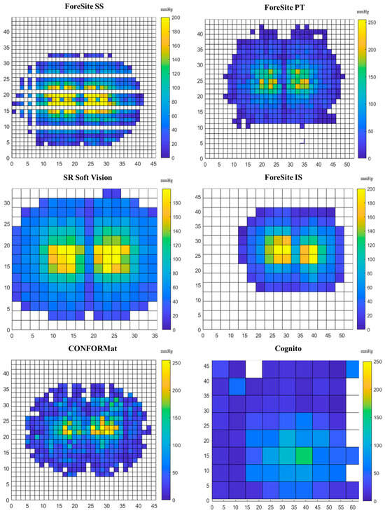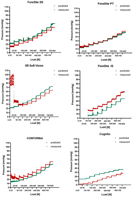 The differences between predicted and measured pressures did not follow a consistent trend in relation with both the resolution of the systems and the loading conditions. However, it is worth of noting that all systems with the exception of the ForeSite SS and Cognito, showed higher predicted pressure values, as indicated by the positive mean difference in Table 3. In addition, the majority of the systems, showed the lowest difference between predicted and measure at low loading conditions, e.g., 100 N and 200 N.