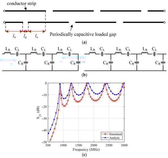 (a) Periodically capacitive gap-loaded parallel plate line; (b) equivalent circuit of capacitive-loaded parallel plate line; (c) simulated and analyzed S21.