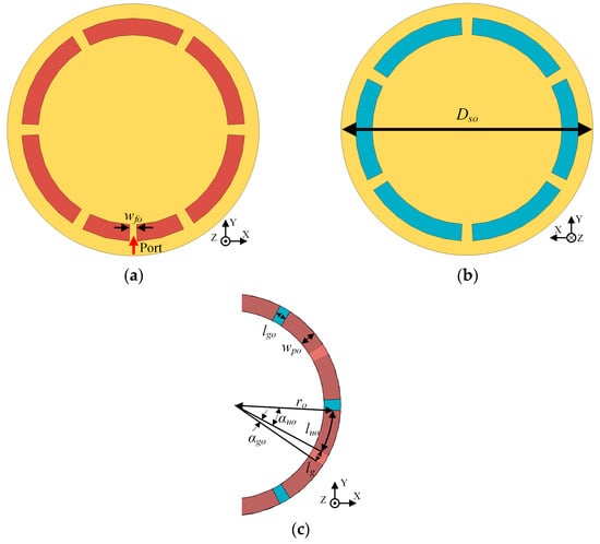 Based on the operation principle of CRLH-TL and the gap-loaded parallel plate structure, a ZPSL transmission line loop antenna is designed by looping the gap-loaded parallel plate line. As shown in Figure 3, the antenna is fed through the gap slotted at the middle of one parallel plate element. According to the previous theory, the antenna has several adjustable key parameters relating to width and length of the strip elements. The effects of varying the width and length of the strip elements are investigated based on full-wave electromagnetic simulations using CST Studio Suite 2024. The results are shown in Figure 4. According to the results of the parametric study, the impedance of the ZPSL loop antenna is tuned to 50 Ω. A 12-element CRLH loop antenna is designed on a 1.57 mm thick FR-4 substrate (εr = 4.4, tanδ = 0.020). The detailed dimensions of the loop antenna are shown in Table 1.