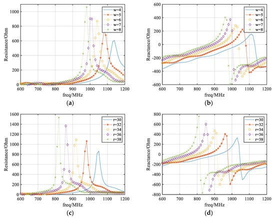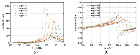 The impedance diagram of the ZPSL loop antenna: (a) resistance with varying width; (b) reactance with varying width; (c) resistance with varying radius; (d) reactance with varying radius; (e) resistance with varying arc angle; (f) reactance with varying arc angle.