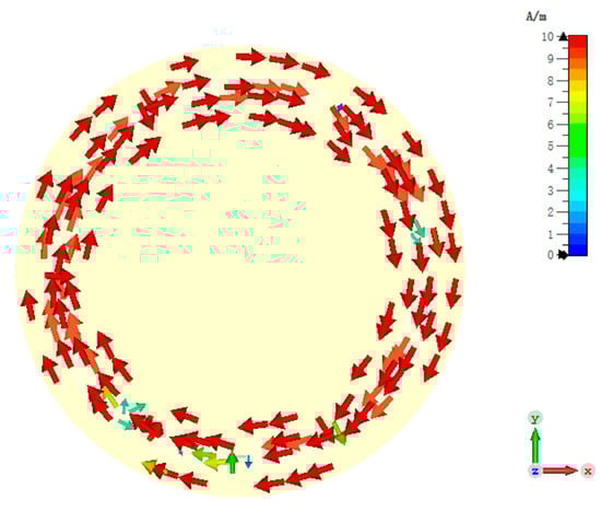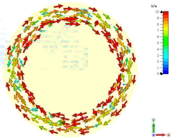 The ZOR frequency is tuned to 866.5 MHz, which is the center frequency of the UK UHF RFID band. The simulated surface current distribution of the ZPSL transmission line loop antenna at 866.5 MHz is shown in Figure 5. According to the simulated surface current distribution, the loop antenna achieves ZOR at 866.5 MHz. The phase constant is zero and the surface current remains in phase, which results in strong and uniform results in its near-field distribution. The near-field distribution can benefit the near-field RFID tag interrogation, which results in its good performances in applications such as smart shelves, asset management, and RFID tag-based sensing.