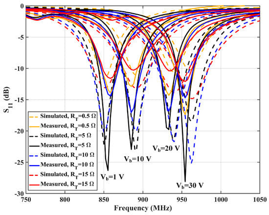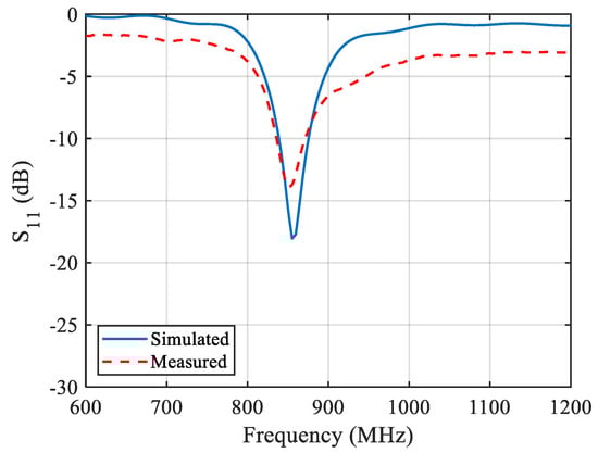 To validate the performance of the design, the antenna is simulated with the CST full-wave electromagnetic simulation software and measured with an Agilent E5071 vector network analyzer (Agilent Technologies, Manchester, UK). The bias voltage varies from 1 V to 30 V to provide between 2.1 pF and 18.7 pF capacitance. The trimmer resistors are tuned from 0.5 Ohm to 15 Ohm to vary the reading distance. Figure 10 shows the simulated surface current of the antenna at ZOR. An in-phase surface current is achieved. As illustrated in Figure 10, the antenna shows an in-phase surface current distribution, which results in a strong vertical H-field. In addition, the current intensity is not strictly uniform because of the introduction of the trimmer resistors and the varactors. This may cause distortion in the H-field distribution and the far-field radiation pattern, which will be analyzed later. Figure 11 shows the simulated and measured S11 of the proposed antenna. According to the results, the designed antenna has an impedance bandwidth (S11 < 10 dB) of 23.78 MHz (2.74%, 846.43–870.21 MHz) for the 866.5 MHz operating mode. This narrow single-mode impedance bandwidth avoids violating national RFID radio frequency (RF) regulations, even if a wideband RFID reader is used. The overall impedance bandwidth is 146.72 MHz (16.93%, 832.50–979.22 MHz) when the trimmer resistors are set to 0.5 Ohm, which can cover the worldwide UHF RFID band.