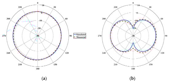 Simulated and measured far-field gain of the reconfigurable antenna at 866.5 MHz: (a) E-plane; (b) H-plane.