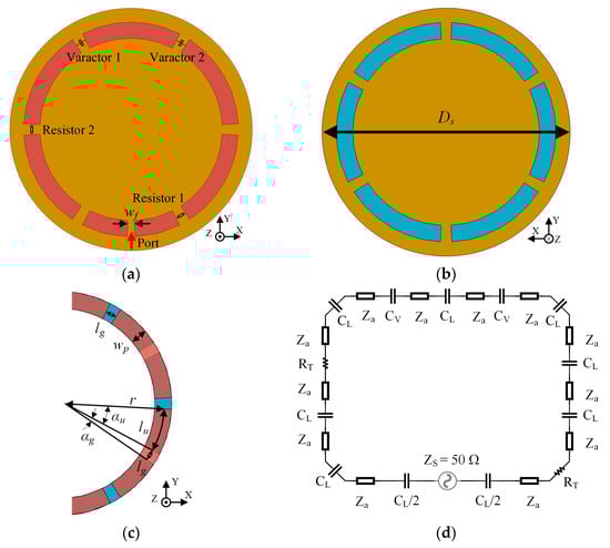 The designed prototype of the CRLH-TL loop antenna is shown in Figure 9. The parallel plate line lies on a 1.57 mm thick circular FR-4 substrate (εr = 4.4, tanδ = 0.020) and is slotted periodically to introduce LH capacitance. The antenna is designed to have 12 periodical units, each containing a unit of parallel plate line and a loaded gap, which is shown in Figure 9c. The antenna is fed at the center of one strip section. To achieve frequency reconfigurability, varactors are added in addition to the loaded gaps, which provides tunable LH capacitance. Two of varactors with a variation range from 2.1 pF to 18.7 pF are added to the two gaps furthest from the feed point to enlarge frequency tuning range to cover the worldwide UHF RFID frequency. Moreover, trimmer resistors are added to adjust the intensity of the radiating current. Figure 9d shows the equivalent circuit of the loop antenna. In this way, the far-field gain and H-field strength are controlled, corresponding to a reconfigurable far-field reading distance and a near-field interrogation zone. The dimensions and the position of trimmer resistors are optimized with the CST full-wave simulation to make the antenna match to 50 Ohm in every operation mode. Table 2 shows the optimized dimensions of the antenna.