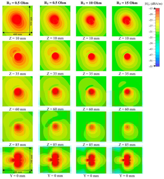 Simulated vertical H-field (|HZ|) distributions on the X-Y plane and X-Z plane at different reading distances of the proposed reconfigurable antenna.