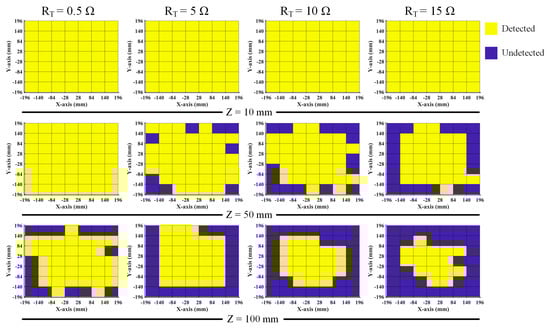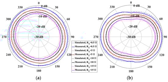 The simulated vertical H-field distributions on X-Y planes at differing reading height Z are shown in Figure 12. A vertical H-field stronger than 0.02 A/m is generated over an area of 400 mm × 400 mm within 50 mm distance when trimmer resistors read at 0.5 Ohm, which is sufficient for RFID operation. The H-field is suppressed when the resistance of the trimmer resistor is increased, which results in a confined near-field detection area and a reduced tag reading distance. The far-field radiation patterns at an 866.5 MHz operating frequency with different tuning resistances are shown in Figure 13. The antenna is measured to have a maximum far-field gain of −0.6 dB with a 1.9 dB gain variation when operating in the multi-service mode (R = 0.5 Ohm). The distortion caused by the trimmer resistors and varactors are acceptable. The maximum far-field gain is suppressed to −7.1 dB when the resistance is increased to 15 Ohm, which can be considered as a pure-near-field mode. The practical impact of resistance on the interrogation zone is measured.