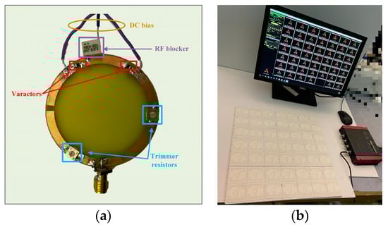 (a) Prototyped reconfigurable CRLH-TL loop antenna; (b) experiment setup.