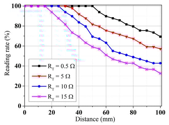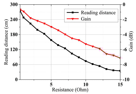 To validate the antenna’s RFID performance in the different operating modes, the CRLH-TL loop antenna is validated with tag detection tests. Figure 14a shows the prototyped antenna. An RF blocker is used to filter the impact from external DC bias voltage. Figure 14b shows the experimental setup. The tag detection test is performed with an Alien 9900+ RFID reader (Alien Technology, Manchester, UK). A 400 mm × 400 mm foam board is divided equally into 49 cells, each attaching an ALN-9634 tag to test the NF interrogation zone of the loop antenna [45]. The tag board is placed above the antenna and is gradually moved away from the loop antenna in 10 mm increments. Also, the maximum far-field tag reading distance of the antenna is recorded. Figure 15 shows the trends of gain and far-field reading distance when the tuning resistance is increased. The maximum far-field reading distance is decreased to 35 cm from 272 cm while the peak far-field gain is suppressed to −7.1 dB from −0.6 dB, which changes the antenna to near-field mode from multi-service mode. Figure 16 shows near-field tag reading rate in the near-field test and Figure 17 shows the corresponding reading cells of the tag board at different reading distances. The R = 0.5 Ohm mode provides a reading zone of 400 mm × 400 mm × 50 mm or a higher reading distance in the central area, while the R = 15 Ohm mode provides a reading zone of 400 mm × 400 mm × 20 mm. Moreover, the reading zone is confined in higher reading heights when the resistance is increased. Table 3 shows the performance comparison of this work and state-of-art investigations. Compared with other works, this design has overcome shortcomings such as low interrogation distance [17,46], and narrow bandwidths [5,8,17]. Compared with the existing loop antenna such as [14,17] and CRLH structures such as [14,39], this work has lower design complexity, a miniature size, and reconfigurability.