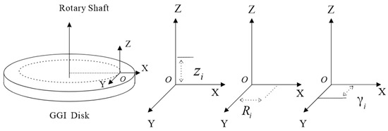 As shown in Figure 2, a rectangular coordinate system is established, with the ideal installation position O of the accelerometer’s centroid serving as the origin. The Z-axis is parallel to GGI’s rotation axis, the X-axis passes through the disk’s center, and the Y-axis is tangential to the rotation trajectory. The error in the actual installation position of the accelerometer’s centroid and the ideal position can be described using errors in three directions: vertical error, radial error, and tangential error, with the positive directions being the coordinate system’s axes. They are denoted as , , and , respectively. Hence, the position vector of the actual installation location of the accelerometer is expressed as follows: