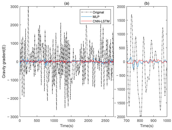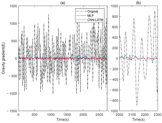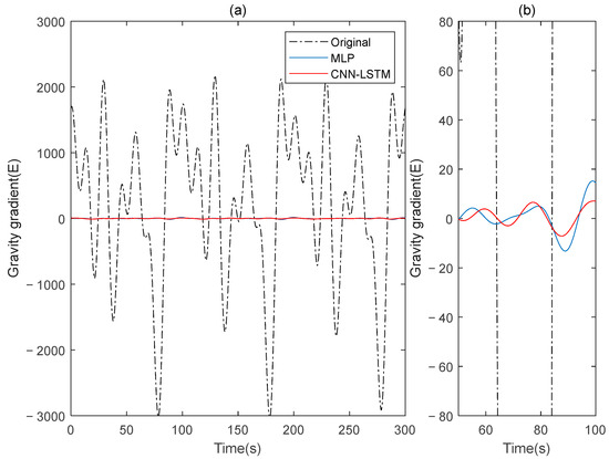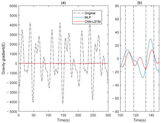 The gravity gradient component compensated by MLP and CNN-LSTM in measured signal: (a) all; (b) part.