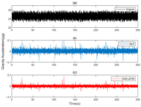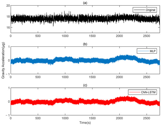 The gravity acceleration in measured signal: (a) original; (b) compensation results of the MLP; (c) compensation results of the CNN-LSTM.