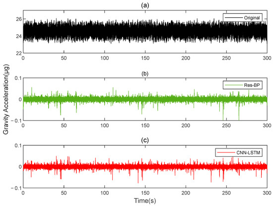 The gravity acceleration in Signal A: (a) original; (b) compensation results of the Res-BP; (c) compensation results of the CNN-LSTM.