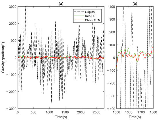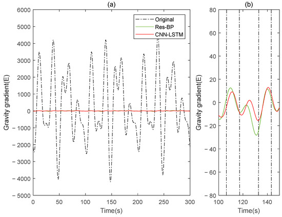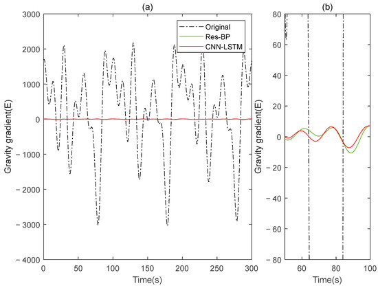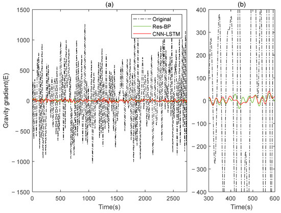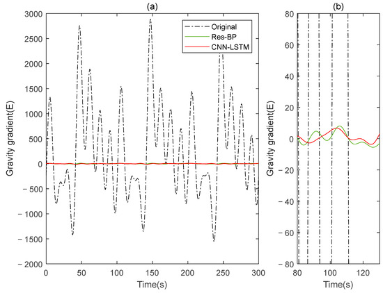 The gravity gradient component compensated by Res-BP and CNN-LSTM in measured signal: (a) all; (b) part.