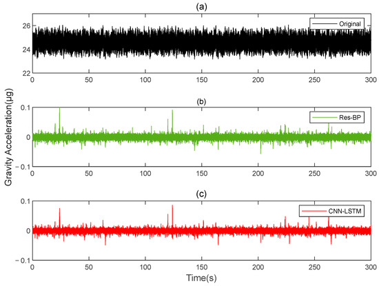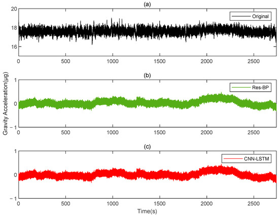 The gravity acceleration in measured signal: (a) original; (b) compensation results of the Res-BP; (c) compensation results of the CNN-LSTM.