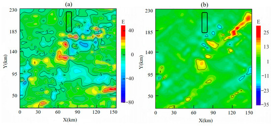 Gravity gradient reference field of measured data upward continuation to 3600 m: (a) ; (b) .
